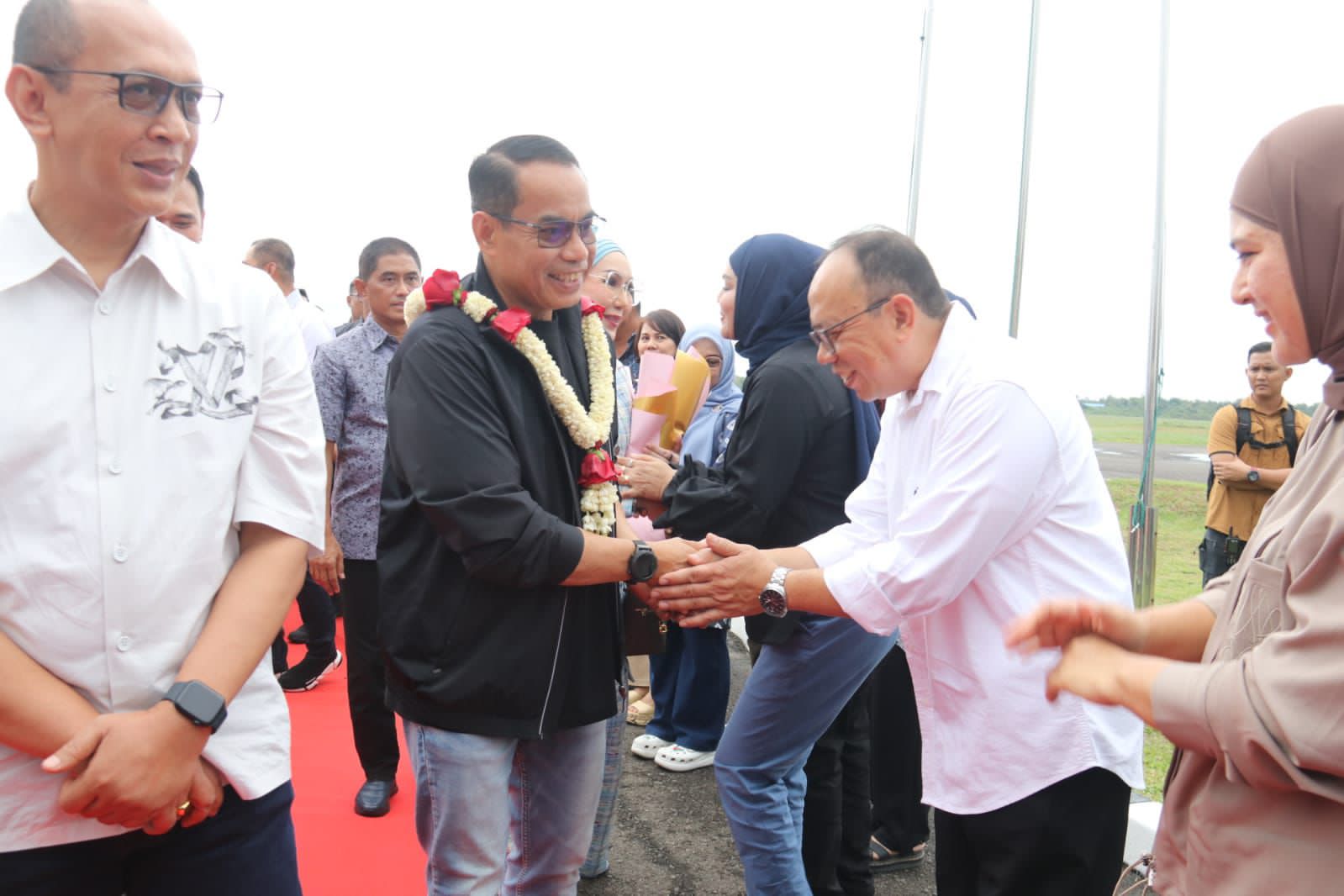 PALEMBANG, NAGARA.ID – Kapolda Sumatera Selatan yang baru Irjen Andi Rian R Djajadi beserta istri Dewy Andi Rian mendarat di bandara Sultan Mahmud Badaruddin II Palembang disambut pengalungan bunga oleh Waka BSSN RI yang juga mantan Kapolda Sumsel, Komjen A Rachmad Wibowo beserta istri, Panglima Kodam II Sriwijaya Mayjen TNI Naudi Nurdika dan segenap unsur Forkopimda Plus Provinsi Sumsel, Wakapolda Brigjen M Zulkarnain, Pejabat Utama Polda dan istri serta Kapolres sejajaran Polda Sumsel dan istri, pada Minggu sore (29/9/2024).